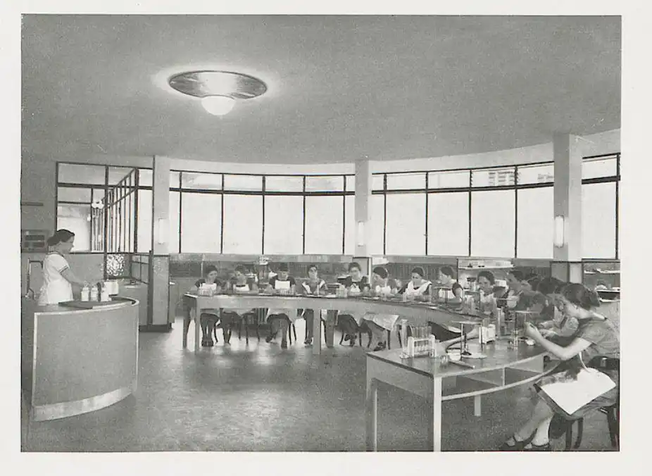 In ihrer Konzeption verwarf sie die bisherige Gestaltung von Schulküchen als Großküchen und propagierte einen halbrunden Baukörper als Idealtypus, der am Rand Küchenkojen für Arbeitsgruppen in Haushaltsgröße bot. Im Zentrum sollten ein Lehrpult und ein halbrunder Tisch mit Gasanschlüssen für den theoretischen und experimentellen Unterricht stehen.